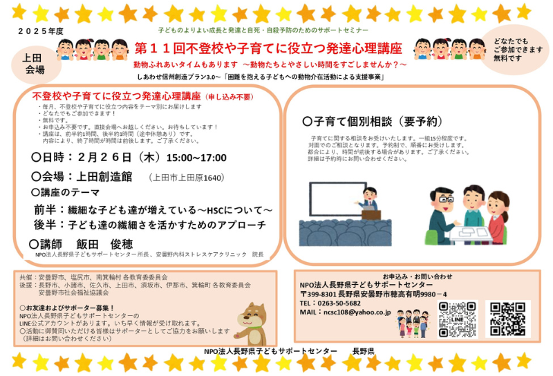 | 不登校や子育てに 役立つ発達心理講座 | 前半:繊細な子ども達が増えている~HSCについて~ 後半:繊細さを活かすアプローチ ※各1時間(講座の内容により時間が前後する場合があります) 途中休憩あり。 |