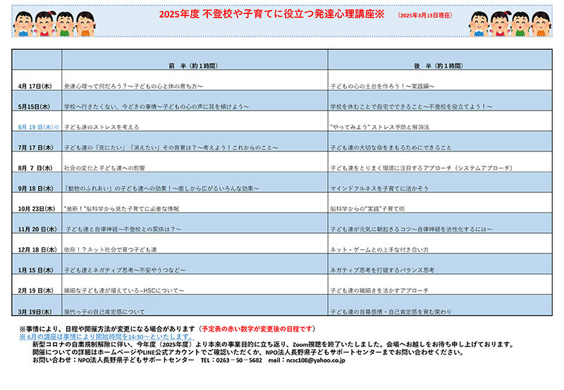 | 不登校や子育てに 役立つ発達心理講座 | 前半:現代っ子の自己肯定感について 後半:子ども達の自尊感情・自己肯定感を育む関わり ※各1時間(講座の内容により時間が前後する場合があります) 途中休憩あり。 |