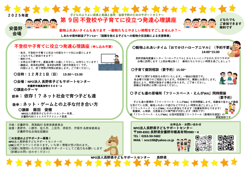 | 会場 | NPO法人 長野県子どもサポートセンター (長野県安曇野市穂高有明9980-4) |